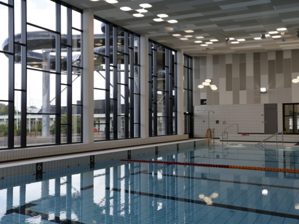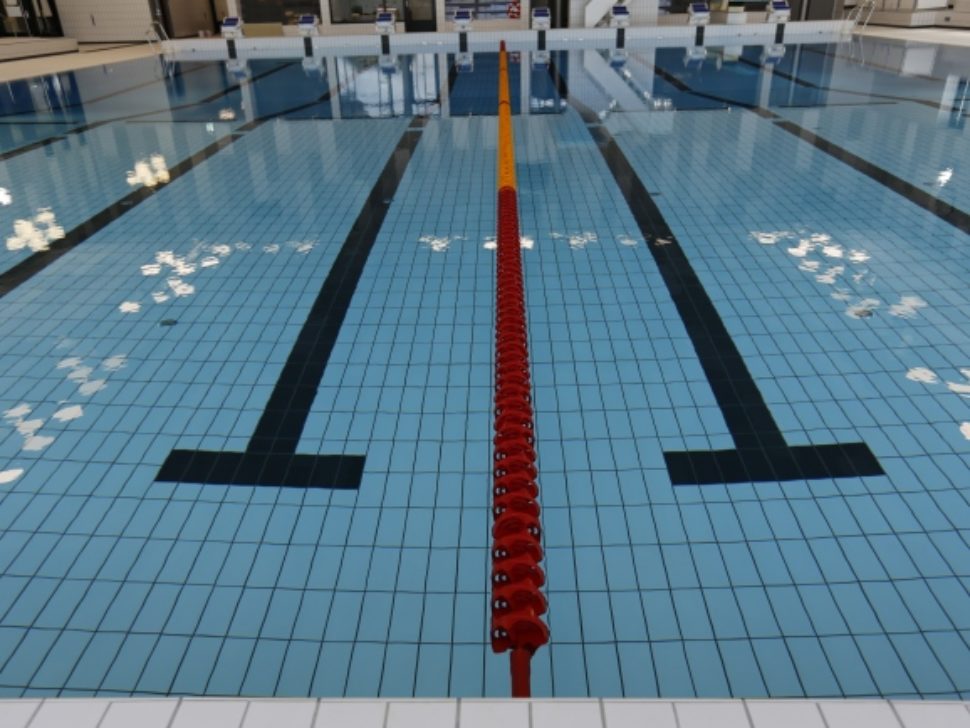 The pool holds a water temperature of 28 degrees, is 25 meters long and has 8 wide race tracks. The bottom part is 1.2–1.6 meters deep and the depth section with 1 meter and 3 meter trampoline is 3.8 meters deep.