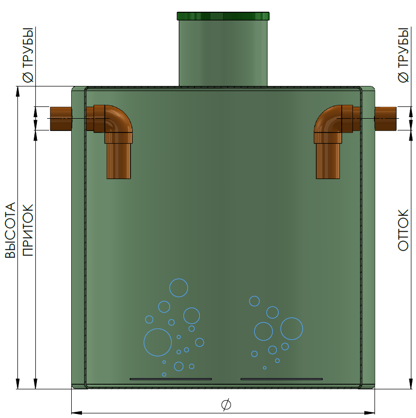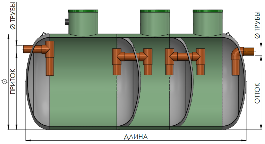 Септик разделен на три внутренних отсека. Осаждение происходит в нижней части. Для успокоения потока и предотвращения турбулентности на входе и выходе устанавливается более длинное колено. Сточные воды поступают в отстойник, где масло, жир и частицы, которые легче воды, всплывают на поверхность, а более крупные и тяжелые вещества опускаются и оседают на дно.