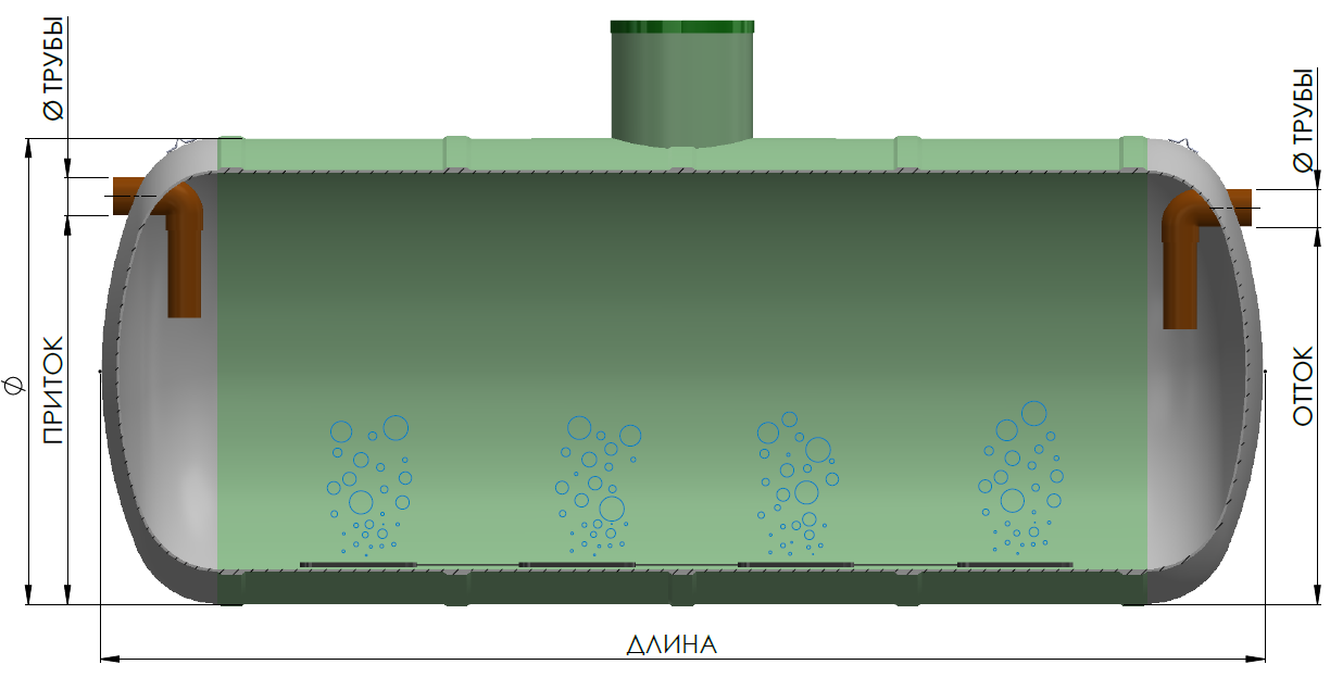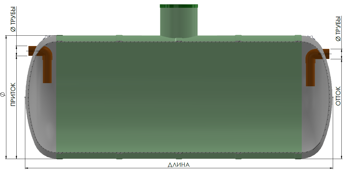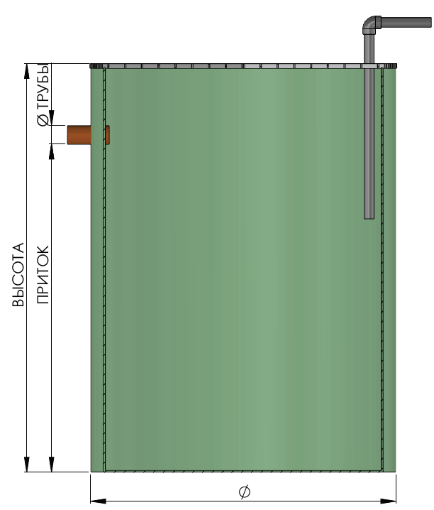 | Е.Н. | ОБЪЕМ [л] | количество емкостей | Ø [mm] | ДЛИНА [mm] | Ø ТРУБЫ [mm] | ПРИТОК [mm] | ОТТОК [mm] |
